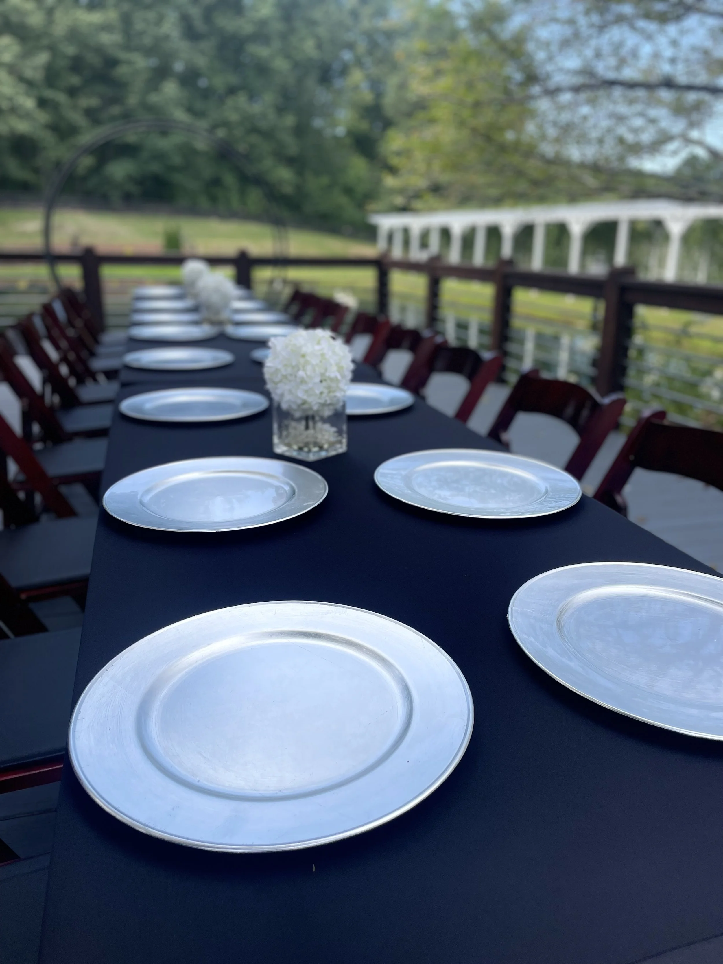 Chairs and tables available with choice of white or black linens for tables in reception area.
